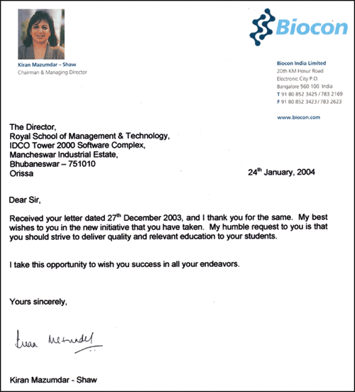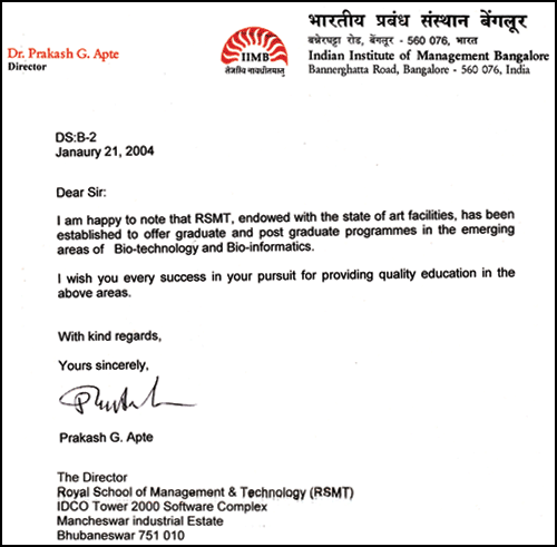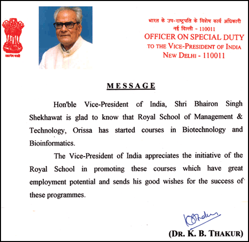 RSMT is indebted to Shri. Bhairon Singh Shekhawat Honourable Vice President of India, Dr. Prakash G Apte - Director IIM Bangalore & Ms. Kiran Mazumdar Shaw - Chairman & Managing Director of India's No.1 Biotechnology Company BioCon India Limited for conveying their appreciation and wishes to RSMT, for its endeavour in the field of Biotechnology & Bioinformatics.